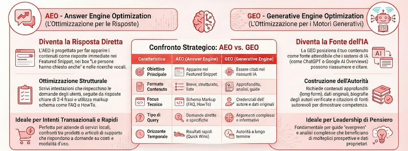 La SEO punta a posizionare un sito tra i primi risultati di ricerca Google. La GEO mira a far apparire il brand all'interno delle risposte generate dall'intelligenza artificiale (come ChatGPT), puntando sull'autorevolezza e le citazioni. L'AEO, invece, si concentra sulle risposte dirette e immediate per la ricerca vocale o i box rapidi, ottimizzando i contenuti per risolvere istantaneamente un dubbio dell'utente.