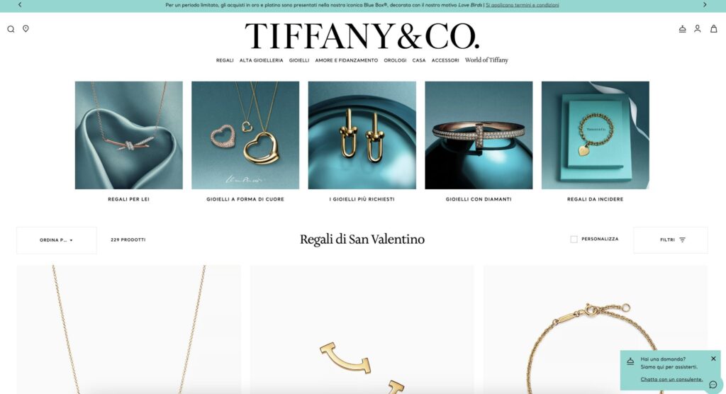 In questo caso, Tiffany & Co. non solo ha ideato una landing page di successo, con una selezione di gioielli che rispecchiano completamente la natura della festività, ma in aggiunta vediamo in basso a destra un banner dove il potenziale acquirente può aprire un servizio chat gratuito che assisterà nella ricerca del regalo perfetto tra tutti quelli proposti.