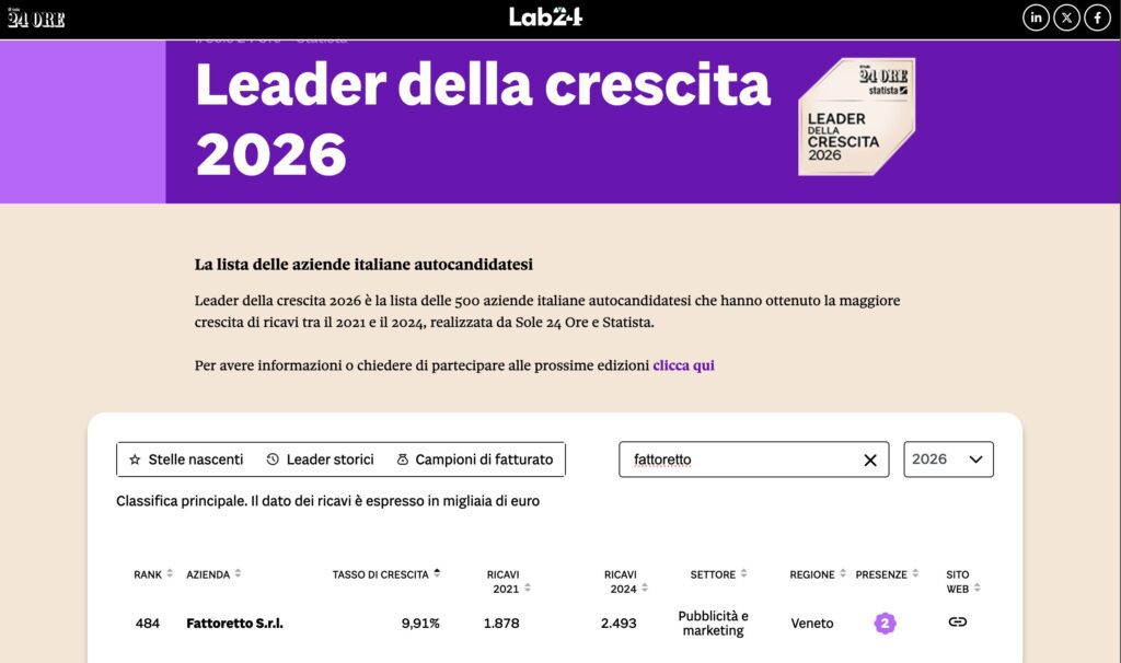 Il Sole 24 Ore e Statista inseriscono Fattoretto Agency tra le 500 aziende italiane con la maggiore crescita di ricavi nel triennio 2021-2024.