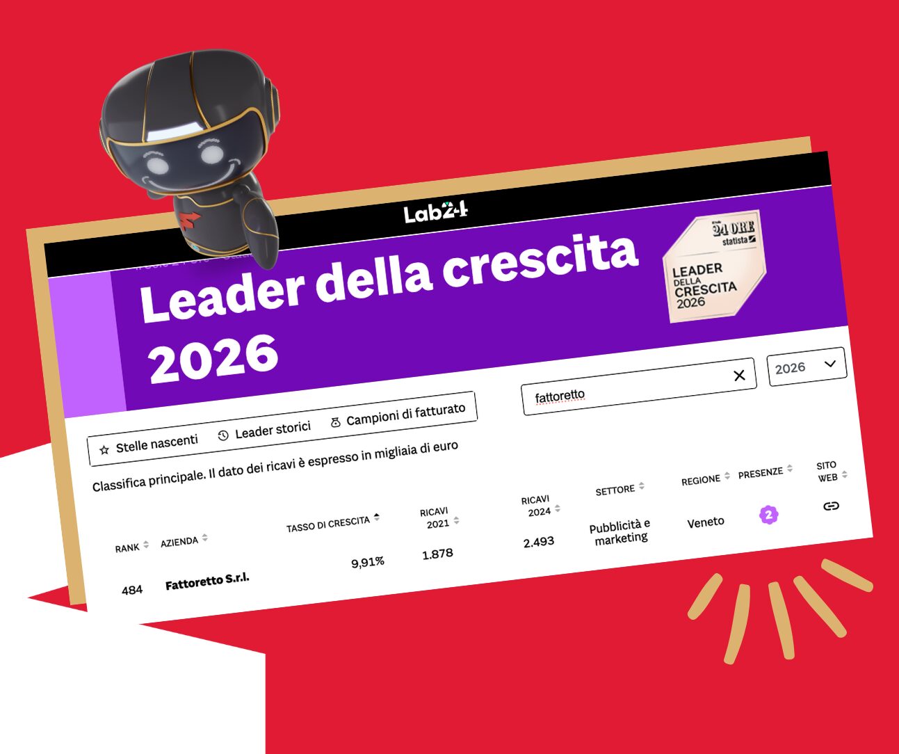 Un riconoscimento prestigioso che ci vede, per il terzo anno consecutivo, tra i Leader della Crescita 2026, la classifica che analizza in modo rigoroso i tassi di crescita e l’evoluzione delle imprese più dinamiche del Paese.